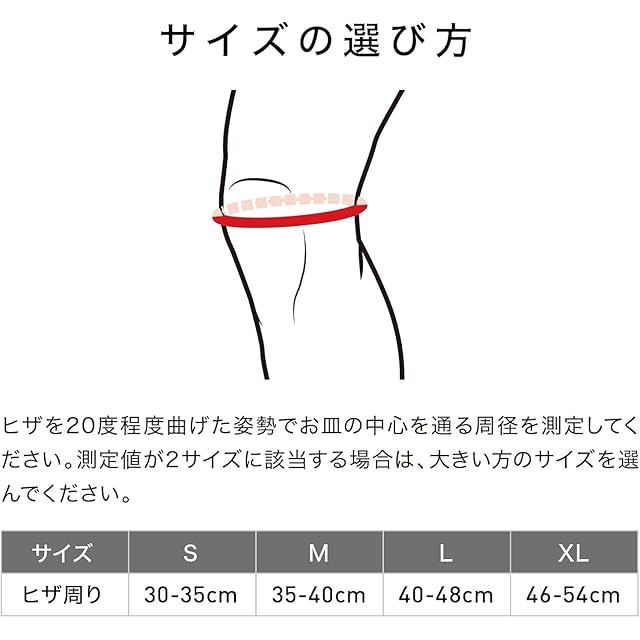 サイズ(ヒザ周り/cm):S/30-35, M/35-40, L/40-48, XL/46-54