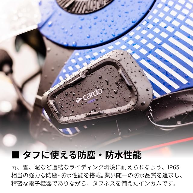 タフに使える防塵・防水性能:雨、雪、泥など過酷なライディング環境に耐えられるよう、IP65相当の強力な防塵・防水性能を搭載。精密な電子機器でありながら、タフネスを備えたインカムです。