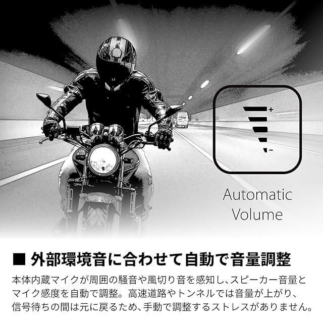 外部環境音に合わせて自動で音量調整:内蔵マイクが周囲の騒音や風切り音を感知し、スピーカー音量とマイク感度を自動調整。高速道路やトンネルでは音量が上がり、信号待ちの間は元に戻ります。
