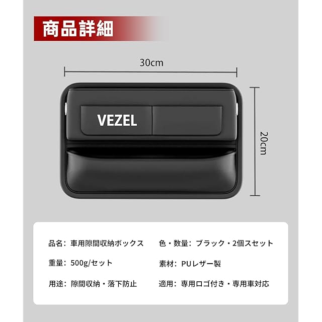商品名:【ホンダ ヴェゼル 専用】隙間収納ボックス VEZEL 専用ロゴ シートサイドポケット 車 ヴェゼル RV 系 RV3 RV4 RV5 RV6 対応 大容量 収納 小物入れ 落下防止 カー用品 車内 アクセサリー 便利グッズ PUレザー 運転席+助手席用 ロゴ左右方向対応 2個セット (ブラック, ヴェゼル 専用)