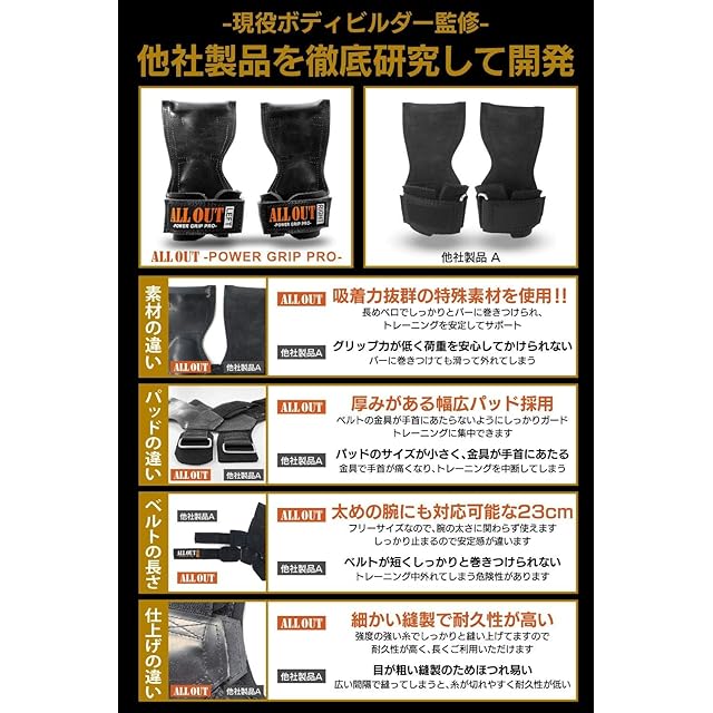 【現役ボディビルダー監修】 日本代表ボディビルダー浅野喜久男が監修。従来のパワーグリップの弱点を完全克服。浅野氏の監修の基、開発されたパワーグリップ。 【商品の特徴】 強力なグリップ力を発生するだけでなく、グリップ面の素材を強化し手首にあたるクッション性を高めました。使用中に手首が痛くならず、快適に利用することができます。耐久性が強く、摩擦・摩耗性に優れた特殊ノンスリップラバー生地を採用し、高いホールド力を実現しました。 【安心の返品返金付き】 品質に自信があります。安心してお使いください。 【類似品に注意してください!】 粗悪な類似品が出回っております。パワーグリップはALLOUTの正規品をお買い求めくださいませ。【商品のコンディションに関して】 ■税関チェックにて袋は一度開封がされております。 ■出荷工程の中で傷、汚れがつくことがございますが、商品自体は新品商品となっており使用上の問題はございません。 お手数ですが濡れたタオルで軽くふいていただけますと落ちますので、汚れ等が気になる場合はふき取ってご利用いただけますと幸いです。 返品・交換は受付しておりますので、商品お届け後1週間以内に 【 公式 】 ALL OUT トレーニングギア 専門店までお気軽にご連絡くださいませ。