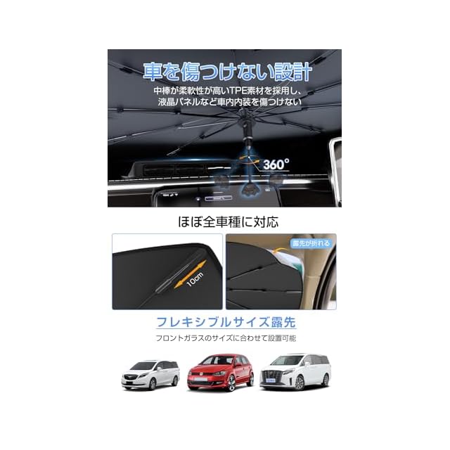 商品名:【新設計 完全フィット】 車用サンシェード フロント 360°折れる中棒 12層ナノ断熱素材 傘型 折りたたみ式 サンシェード 車用 遮光 遮熱 UVカット 紫外線遮蔽 取付簡単 バックミラー開き口 棒なし TPU中棒設計 内装を傷つけない 強化10本骨 日焼け対策 車中泊 仮眠 暑さ対策 収納ポーチ付き 10cm露先が折れる可能 ワンサイズでほぼ全車種に適用