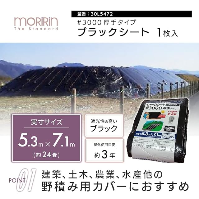 商品名:モリリン ブラックシート レジャーシート #3000 実寸約5.3m×7.1m 約24畳 厚手 屋外使用目安約3年 ハトメ数28 雨よけ 風よけ 野積み 30L5472
