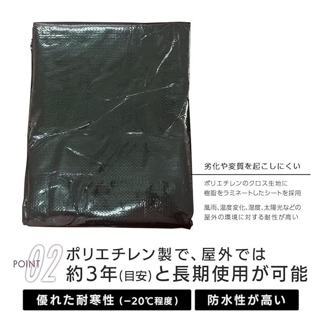 【仕様】本体サイズ:5.4×7.2m(呼称)、実寸サイズ:5.3m×7.1m(約24畳)/材質:ポリエチレン(本体)、アルミニウム(ハトメ)/ハトメ数:28ヵ所/ハトメ間隔:約90㎝/屋内仕様目安:約3年/カラー:ブラック