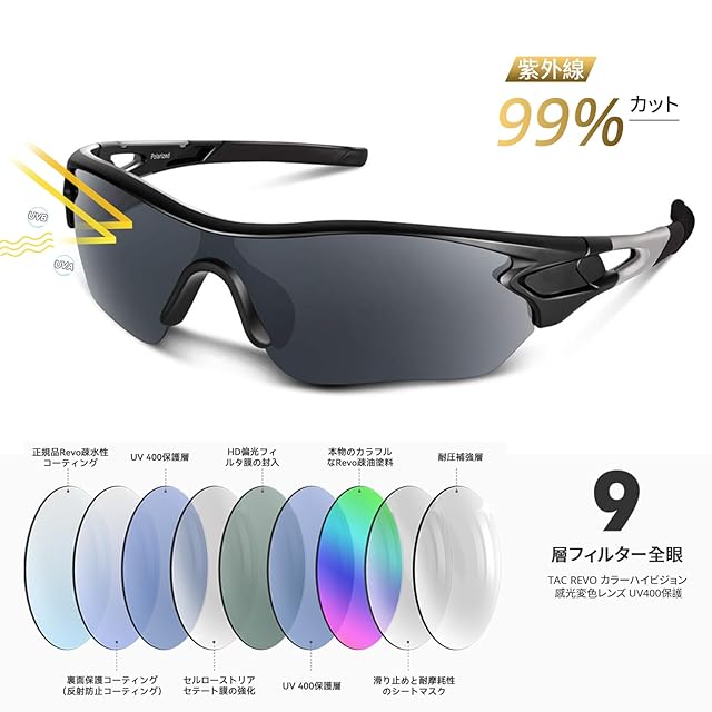 高品質のREVOカラーハイビジョン偏光レンズ:すべての偏光レンズは高品質破砕防止TAC材料で作られており、UV 400レンズ保護コーティング、有害なUVAとUVB 99.9%をブロックし、本物の色を復元し、REVO偏光レンズを使用して元の色を維持し、効果的に視覚の透明度とコントラストを改善し、より簡単に反射や散乱光を排除します。偏光サングラスは風景をよりクリアで柔らかくし、目の負担を減らします