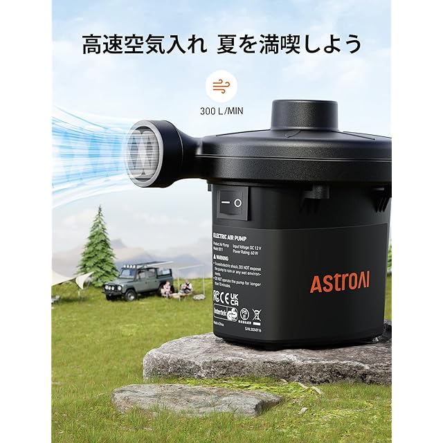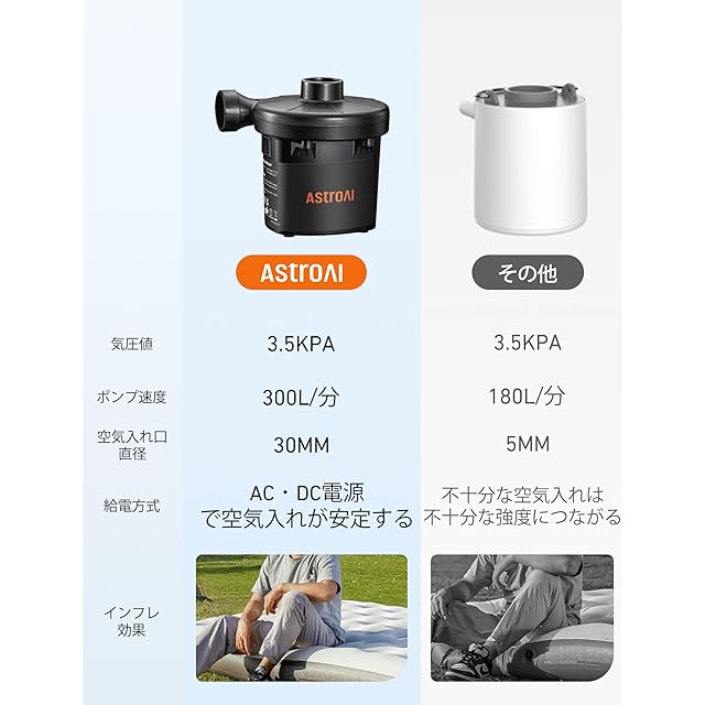 商品名:AstroAI 空気入れ プール AC電源/DC電源/充電式バッテリー給電 tiny pump 電動エアーポンプ タイニー ポンプ 空気抜き 両対応 3種類のノズル付き PSE認証済み 小型浮き輪 ゴムボート エアベット ビニール ブール適用