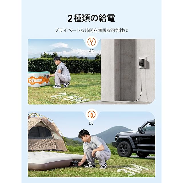 【上品な電源アダプター】:110V AC電源アダプターと12VDC車用電源アダプターを装備しています。シーンに合わせて使い分けられるエアポンプです! 家庭用だけでなく、アウトドアにも最適です。夏にはこんな便利なエアポンプが必須です!
