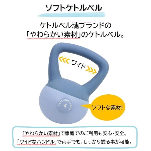・【やわらかい素材のケトルベル】ケトルベル魂ブランドの「やわらかい素材」のケトルベル。 衝撃を吸収する「やわらかい素材」のため、体にぶつけた際の衝撃も大幅に軽減されます。・【幅広いハンドル窓】ハンドル部分はワイドで硬めの素材のため、両手でもしっかり握ることが出来、ハンドルから手が離れるリスクも軽減されます。・【ご家庭での利用に最適】表面の素材はPVC、球体内部は砂鉄・砂のため、床や壁への衝撃も大幅に緩和。ご家庭内でも安心してトレーニング頂けます。・【重量バリエーション】★2kg 4kg 6kg 8kg 10kg 12kg 16kgを取り揃えています。★モニターの発色の具合によって実際のものと色が異なる場合がございます。製造ロットにより、商品本体の色あいが異なる場合がありますこと、予めご了承の程よろしくお願いいたします。・★ケトルベルの重量ごとに砂の量と空洞部分の割合が異なりますため、重量によっては砂の揺れ(砂の音)を大きく感じる事が有ります事、予めご了承の程お願いいたします。★日光により、色あせが生じることがありますのでご注意下さい。ゴムとの接触により、変色することがありますのでご注意下さい。