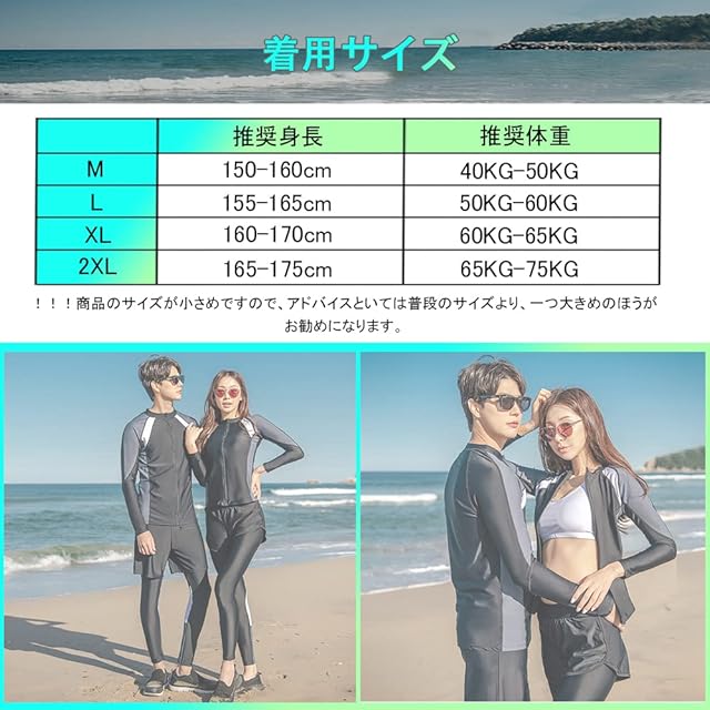 !!!商品のサイズが小さめですので、アドバイスといては普段のサイズより、一つ大きめのほうがお勧めになります。【セット内容&着用サイズ】長袖ラッシュガード、ショートパンツ、ブラ、レギンス、ビギニショーツがセットになっています。必要なものがセットになっているので、届いてすぐに海に行くことができます。長袖ラッシュガードとレギンスセット、レギンス付き足首まであるので、虫刺されやクラゲ対策、擦り傷などの外傷対策にも。【着用サイズ】【M: 推奨身長150-160cm/推奨体重:40KG-50KG】【L:推奨身長155-165cm/推奨体重:50KG-60KG】【XL:推奨身長160-170cm/推奨体重:60KG-65KG】【2XL:推奨身長165-175cm/推奨体重:65KG-75KG】※サイズを選択する時サイズ表を参照してください。