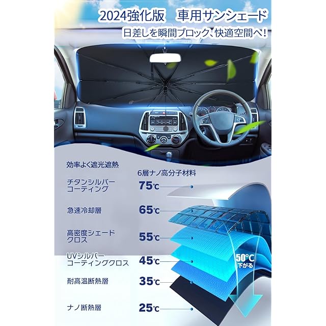 【ほとんどの車種に対応】4サイズから選べる傘型サンシェードは、軽自動車サンシェード、コンパクトカー、コンパクトSUVから大型SUV、ミニバン、商用バンまでほとんど全ての車種のフロントガラスに対応しています。※少し高さが足りない場合はサンバイザーを降ろせば日が入りませんでした。【ご注意】サンシェード 車 フロントは車型によって、多少誤差がありますが、ご購入前に、フロントガラスのサイズご確認ください。