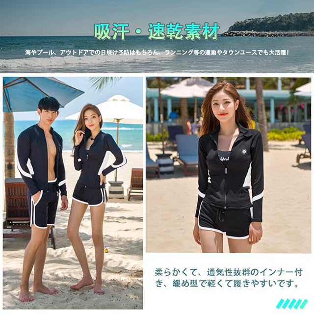 【適用場合&水陸両用】海辺のみならず、軽量なのに伸縮性抜群の生地でとても動きやすく、吸汗・速乾素材なので運動に最適です!夏場のウォータースポーツや野外活動の際、海、ジム、プールやビーチ、、温泉と幅広いジャンルで使える便利なスポーツ・アイテムです。通勤、通学、ランニング、ヨガなど、スポーツウェアとしてもご利用いただけます。水に濡れても快適に活動できる生地を使用。前開き対応のラッシュガードは着脱も簡単です、着替えに便利。