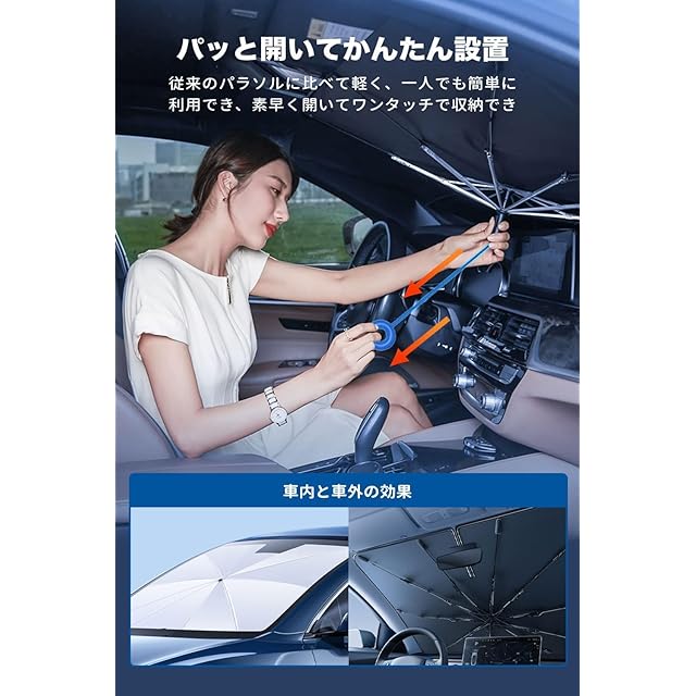 【中棒無しデザイン】中棒無し、取り付け時は車のダッシュボードと内装に傷をつけることがありません。2025年最新版傘型車用サンシェード、伝統的なサンシェードとは異なり、本製品は骨組みに工夫を凝って頑丈な十本の傘骨を採用して優れた耐用性を持っています。耐摩耗性、耐老化性、耐衝撃性が優れている。