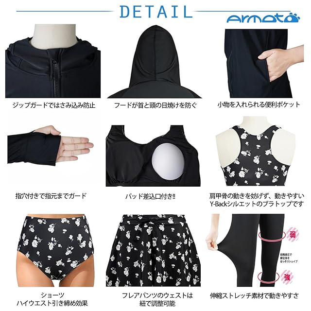商品名:[ARMOTO] 水着 レディース フィットネス 長袖 ラッシュガード フード付き ビキニ ショートパンツ レギンス ショーツ 5点上下セット 大きいサイズ 体型カバー