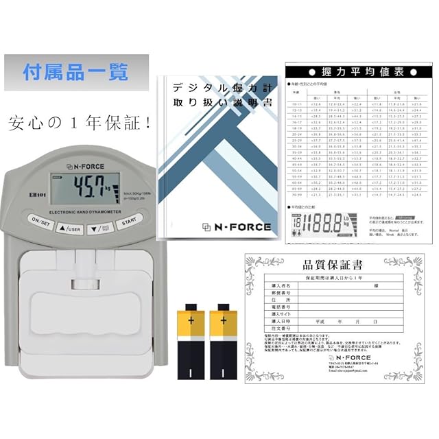 【※乾電池の挿入について】 本体裏面の電池ボックス蓋をスライドして開け、単4アルカリ電池を+が内側になるようにセットしてください。(電池がうまく入らない場合は、電池を指で回転させながら挿入することで簡単に入ります) 日本国内のスポーツジム、介護施設、学校、法人、団体への導入実績が多数あります。もちろん一般家庭でも多く使用されています。 大き目デジタルが特徴の握力測定器。N-FORCE正規品は、ユーザー登録機能付。 正規品ならではの機能1 ⇒ 前回の測定値を上回ると、液晶画面が教えてくれる。やる気が継続します。 正規品ならではの機能2 ⇒ 年齢/性別ごとの握力平均データがインプットされている。平均値は目標の目安になるので、とても便利です。 グリップの幅が自由に調整できるので、手の小さい女性や子供もご使用いただけます。 1年間の製品付き。 握力計測器必ず正規品の購入をお願いいたします。 【以外と知られていない握力の重要性】 ・重い荷物も持てるようになる ・握る力だけでなく、腕力の強化にもなる ・トレーニングすると、二の腕が太くなる デジタル液晶で0.1kg単位までがクッキリ表示されます。 最大90kgまで計測可能。以下の一般的なトレーニング器具との併用を推奨します。 ハンドグリップ ダンベル リストトレーナー トレーニングチューブ