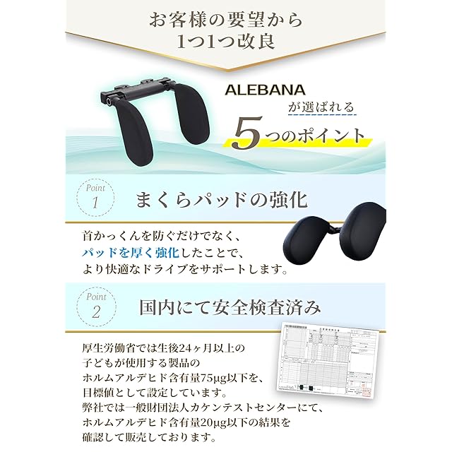 ✅【商品仕様】○サイズ:(片方)高さ22cm×奥行13cm×厚み4cm、設置時横幅最大28cm ○セット内容:ヘッドレストネックサポート本体、調整用アタッチメント2×2セット、 ネックパッド ×2、保護クッション ○ブランド:ALEBANA <365日メーカー付属>商品に不具合がございましたら、ご購入から365日以内の場合、交換、返品させていただきます。
