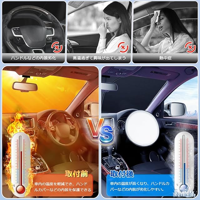 3.【UVカット・断熱・内装劣化防止】:長時間日に当たる後、車の中が蒸し暑くなり、この製品は太陽光を通さない高密度の生地を使用しており、 紫外線を99.9%カットし、強い日光を反射して車内の温度を下げる。長時間の日焼けで内装劣化が防ぐことができる。