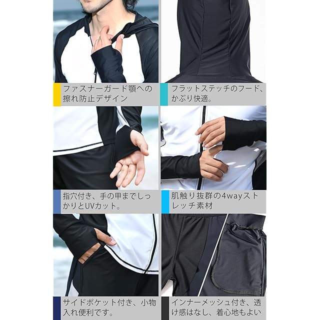 2023年5月新品発売メンズ水着ラッシュガード[フード付き] 豪華3点セットを紹介させていただきます。 素材構成: 82%ナイロン、18% ポリウレタン 3点セット:ラッシュガード「フード付」+サーフパンツ+10分丈レギンス ─ Detail Check Points ─ #1.ラッシュガード「フード付き」、フードを被れば、首周りと頭も紫外線をしっかりガード; #2.ファスナーガード付き、顔や首元への擦れを防止; #3・指穴付き、手の甲まで日焼けを防止; #4・ゴムウェストは紐付きサイズを調整できる; #5・海水パンツは両サイドに側ポケット付き; #6・レギンスにはメッシュインナー付き、安全安心; *伸縮性に優れた生地フィットネスに最適な水着セットです。耐衝撃性の高いポリカーボネイト採用、曇止め加工、UVカット機能を持っている。 *綺麗なラインが出るのですっきり男らしい印象に~ 昼間の暑い日ざしからはもちろん、夕方の浜風での 体の冷えもコレ一枚でバッチリ対策です [UV対策]安心のUPF50+(肌に有害な紫外線を99.8%以上カット)生地使用~様々なシーンで使える「着るだけ」UV対策ウェア。*日焼け対策もこれでバッチリ~スポーティーなオシャレさ抜群ラッシュガード☆ 使いやすいブラックだから海やジムなど、 様々なシーンに大活躍。 *機能性だけでなくデザインも考え抜かれた商品です 海やプールに着たまま出かけて着たまま帰れるオシャレなデザインです。 サイズ レンジ: S:身長:155-165CM,体重:50-60KG; M:身長:165-175CM,体重:60-70KG; L:身長:172-180CM,体重:70-80KG; XL:身長:178-185CM,体重:80-90KG; 2XL:身長:182-195CM,体重:90-105KG;