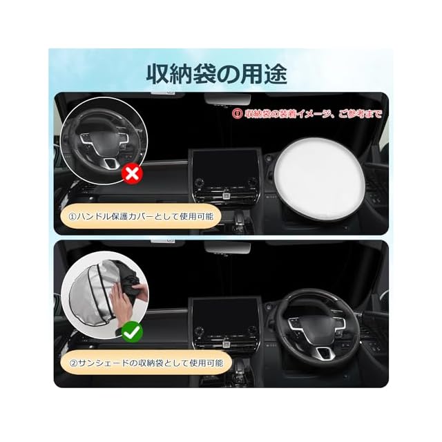 3.【多機能&プライバシー】:アルミ遮熱シートは眩しい光線を抑えることができます。車中泊や休憩時など、外からの視線が気になるときにも役立ち、プライバシーも保護できます。【ストラップ&収納袋付き】:本製品はストラップを設計し、収納する場合、ストラップで収納できます。また、収納袋も改良され、ハンドルカバーに置く可能です。ご注意:アルファードやハイエース専用のサンシェードは大きいですので、収納袋のサイズも少し大きいです。ごハンドルに装着する場合、ちょっと大きいかもしれません。ご了承ください。