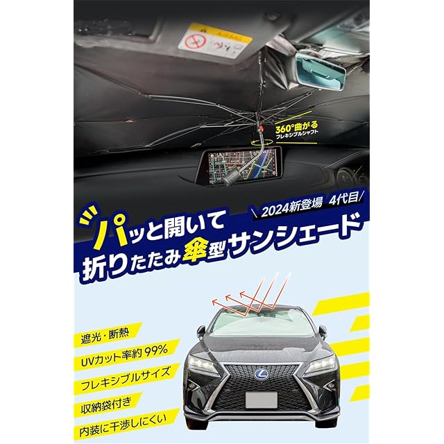 【屈曲可能な傘の柄・ダッシュボード保護デザイン】独自のデザインを採用。ダッシュボードの高低に合わせて、傘の柄を折り曲げて調整することができます。金属製の傘の柄がダッシュボードに接触しないようにして、ダッシュボードを摩擦から保護します。また、ガラスと接する四隅にはプラスチックの保護カバーが付いており、ガラスを傷つけることはありませんのでご安心ください。