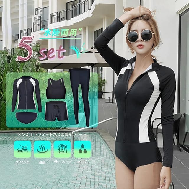 [YFMAYI] 水着 レディース 体型カバー フィットネス水着 5点セット ラッシュガード ショートパンツ タンキニ 長袖 レギンス UVカット 水陸両用
