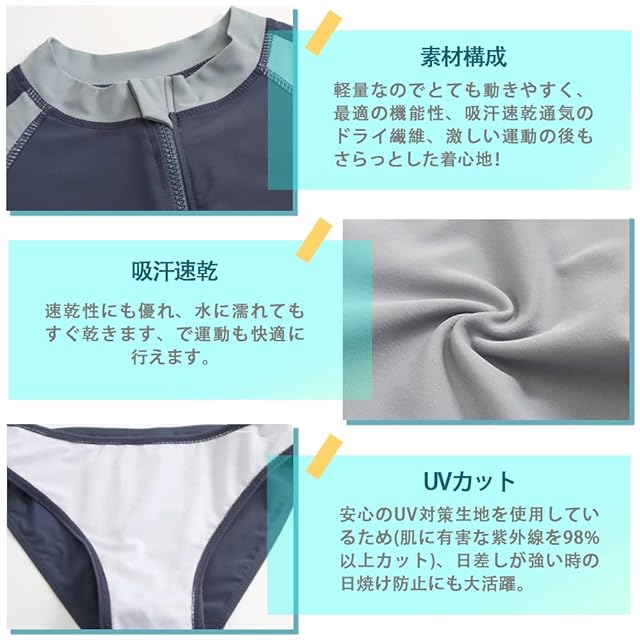 【適用場合&水陸両用】海辺のみならず、軽量なのに伸縮性抜群の生地でとても動きやすく、吸汗・速乾素材なので運動に最適です!夏場のウォータースポーツや野外活動の際、海、ジム、プールやビーチ、、温泉と幅広いジャンルで使える便利なスポーツ・アイテムです。通勤、通学、ランニング、ヨガなど、スポーツウェアとしてもご利用いただけます。水に濡れても快適に活動できる生地を使用。前開き対応のラッシュガードは着脱も簡単です、着替えに便利。