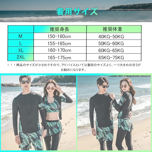 !!!商品のサイズが小さめですので、アドバイスといては普段のサイズより、一つ大きめのほうがお勧めになります。【セット内容&着用サイズ】長袖ラッシュガード、ショートパンツ、ブラ、レギンス、ビギニショーツがセットになっています。必要なものがセットになっているので、届いてすぐに海に行くことができます。長袖ラッシュガードとレギンスセット、レギンス付き足首まであるので、虫刺されやクラゲ対策、擦り傷などの外傷対策にも。【着用サイズ】【M: 推奨身長150-160cm/推奨体重:40KG-50KG】【L:推奨身長155-165cm/推奨体重:50KG-60KG】【XL:推奨身長160-170cm/推奨体重:60KG-65KG】【2XL:推奨身長165-175cm/推奨体重:65KG-75KG】※サイズを選択する時サイズ表を参照してください。