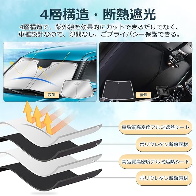 2.【4層構造】:1層目:高品質高密度アルミ遮熱シート、2層目:ポリウレタン断熱素材、3層目:高品質高密度アルミ遮熱シート、4層目:ポリウレタン断熱素材。高い断熱効果がある素材によって、夏の日で強い日差しを遮断して、車内の温度を減ります。冬の日で窓からの冷気の浸入を防ぎ、車内温度をキープして車中泊も快適です。エアコンの効率を良くするので省エネになります。従来品よりも遮光性や保温性を大幅にアップし、夏の日を温度下げて、冬の日を温度を上げる効果があります。エアコンの効率を良くするので省エネになります。ブラックメッシュ仕上げ。✔注意:他社の製品の外観は本社と同じく、でも相手は5層などを宣伝していますが、実際には本社と同じく2層構造です。✔本物の5層は厚くて使用不便、特に頻繁使用の場合、実用性はゼロになります。