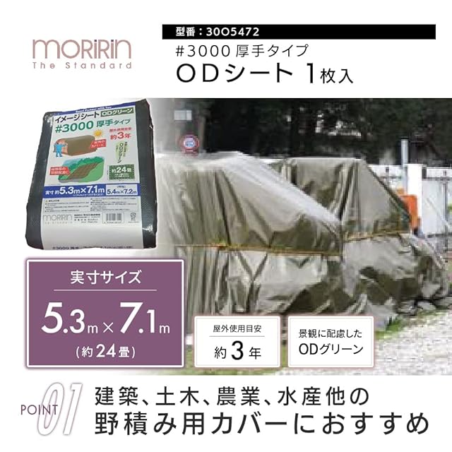 モリリン ODシート レジャーシート #3000 実寸約5.3m×7.1m 約24畳 厚手 屋外使用目安約3年 ハトメ数28 雨よけ 風よけ 野積み 30O5472 OD