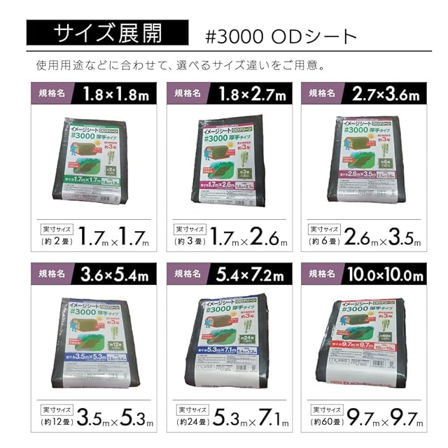 【仕様】本体サイズ:10×10m(呼称)、実寸サイズ:9.7m×9.7m(約60畳)/材質:ポリエチレン(本体)、アルミニウム(ハトメ)/ハトメ数:44ヵ所/ハトメ間隔:約90㎝/屋内仕様目安:約3年/カラー:ODグリーン