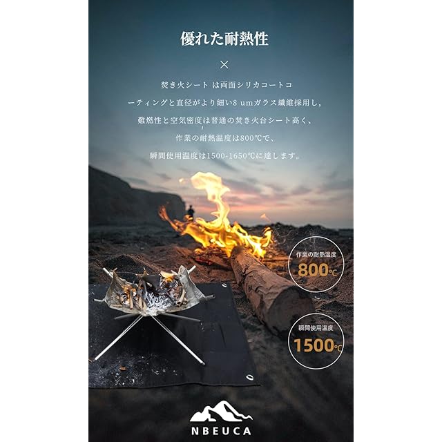【耐火性がより強い】耐熱シート は直径がより細い8umガラス繊維採用し,難燃性と空気密度は普通の焚き火台シート高く、作業の耐熱温度は550℃で、瞬間使用温度は800-1300℃に達します。