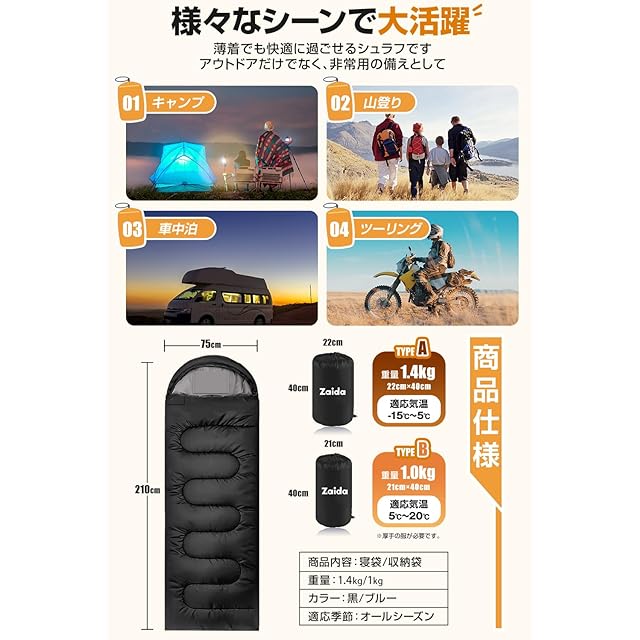 【オールシーズン対応・ゆったりサイズ感】約210*75cm 収納サイズ:約40×20cm 重量:1kg/1.4kg。1kgの場合、適応温度:最低使用温度:0℃ 快適使用温度:10℃-25℃(自身の暑さと寒さの感覚によって使用)。1.4kgの場合、最低使用温度-15℃で超保温。 夏用寝袋 と 冬用寝袋 を揃い、ほとんどのお客様のニーズを満たす、季節や用途により、選べ頂けます。また寝袋は封筒型で、内部に余分なスペースがあり、中で手足を伸ばしたり、楽に寝返りを打てますので、窮屈感が全くありません!