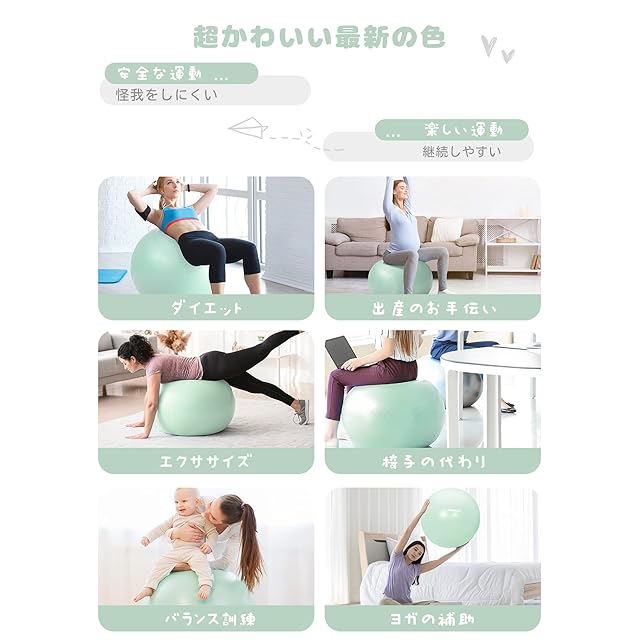 【多目的利用】 バランスボールは、楽しみながらエクササイズできる道具として人気があります。オフィスチェアとして姿勢改善に、ヨガやピラティスのトレーニングボールとしても活用できます。また、リハビリや回復、産後ケアにも役立ち、ストレス軽減や心身の健康促進に寄与します。