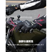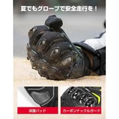 【耐衝撃】拳の部分と関節部分にナックルガードが付き、耐衝撃素材を使用し、転倒時には手が傷つかないようにしっかり保護できます。掌にクッションが付き、運転中の衝撃を吸収できます。