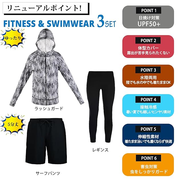 【セット内容】ラッシュガード、レギンス、サーフパンツ。
