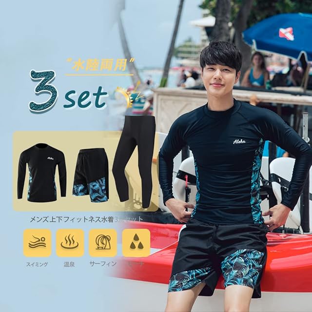 <b>【セット内容】</b><br/> 長袖ラッシュガード、ハーフパンツ、レギンスの3点セット。必要なものがセットになっているので、届いてすぐに海に行くことができます。サーフパンツとレギンスセット、レギンス付き足首まであるので、虫刺されやクラゲ対策、擦り傷などの外傷対策にも。<br/><br/> <b>【素材構成】</b><br/> 伸縮性と通気性に優れており丈夫で破れにくい素材を採用。軽量なのでとても動きやすく、最適の機能性、吸汗速乾通気のドライ繊維、激しい運動の後もさらっとした着心地!<br/><br/> <b>【吸汗速乾】</b><br/> 速乾性にも優れ、水に濡れてもすぐ乾きます、で運動も快適に行えます。前開き対応のラッシュガードは着脱も簡単です、着替えに便利。<br/><br/> <b>【UVカット】</b><br/> 安心のUV対策生地を使用しているため(肌に有害な紫外線を98%以上カット)、着るだけで、うっかり日焼け予防を実現。海やプール、アウトドアでの日焼け予防はもちろん、ランニング等の運動やタウンユースでも大活躍!<br/><br/> <b>【適用場合】</b><br/> スポーツやフィットネスに、サイクリング、スイミング、サーフィン、ダイビング、海水浴、プール、ビーチ、温泉と幅広いジャンルで使える便利なスポーツ・アイテムです。通勤、通学、ランニング、ヨガなど、スポーツウェアとしてもご利用いただけます。