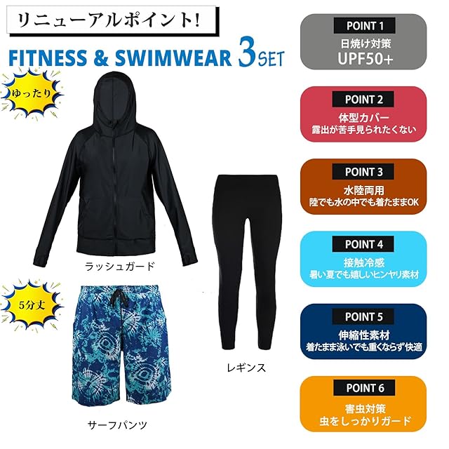 【セット内容】ラッシュガード、レギンス、サーフパンツ。