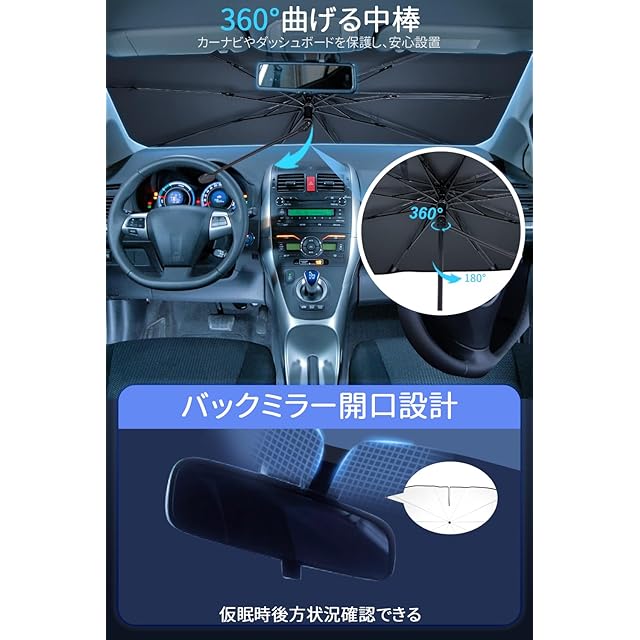 【強化版 曲がる傘柄】 サンシェード 車 フロント 車用サンシェード 折り畳み式 傘型サンシェード 日除け フロントシェード 遮光断熱 車用パラソル 紫外線対策 カーサンシェード 収納便利 収納ポーチ付き バックミラー部切りデザイン プライバシー保護