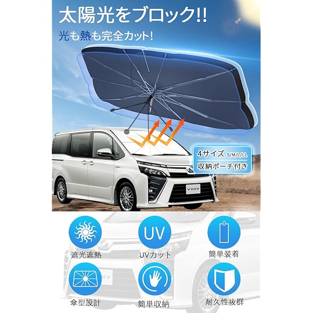 【様々な車に対応可能・幅広い用途】 4サイズ選択可能で99%の車のフロントガラスに対応できます。軽自動車サンシェード、ビジネス車、SUV、MPVなどの中大型車もコンパクトカー、スポーツカーなどの小型車も使用できます。普段駐車時の日除け用だけでなく、車中泊や仮眠時にプライバシーの保護に役に立てます。雨の日に傘を忘れた時本製品も仮の傘として使用でき、炎天下でも仮の日傘として使われます。XLサイズ(150*97cm)対応車:アルファード ヴェルファイア ヴォクシー エスクァイア エスティマ ノア プリウス プリウス プリウスα プリウスPHV オデッセイ ステップワゴン フリード セレナ nv350キャラバン エルグランド シーマ ムラーノなど大型SUV、大型MPV、中小トラック。
