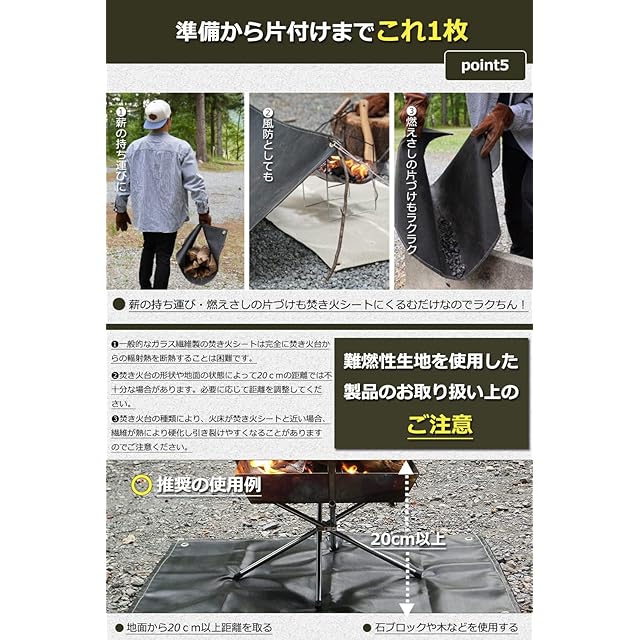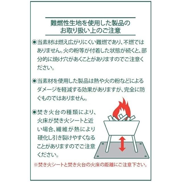 【 地面を守る】✅「耐炎化繊維」で耐熱温度は「1500℃」。焚き火台から発生する放射熱を遮り火の粉や燃えかすがこぼれた時に地面や芝、ウッドデッキ等のダメージを軽減する焚き火シートです。地面を焦がさず環境に配慮しながら焚き火をお楽しみください!縫製の糸も難燃素材のものを利用。 1回の焚き火で糸が焼き切れ、ほつれるという心配もございません。