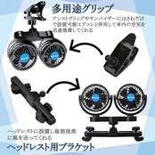 左右180°上下360°角度調節可能:ファンはそれぞれ角度調節できるので、様々な方向へ風を送れます。片側で運転者に風を当てながら、もう片方で後部座席にかぜを送る使い方も可能です。また、多用途グリップ付属しておりますので、ご都合によってアシストグリップやサンバイザーなどに設置していただけます。設置簡単で便利な夏対策品です。