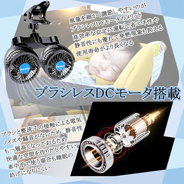 ツインファン設計&エアコン効率UPさせる:ツインタイプで広範囲に風を送り安いので、車内のこもった空気をより迅速に循環していただけます。多くの車にはエアコンが搭載されているものの、後部座席の隅々まで冷風が届きにくい場合があります。車用扇風機を設置すれば、エアコンの併用により、後部座席に直接風を送って、たまった冷気を循環させて、車内全体を快適な温度に保つ効果も期待できます。