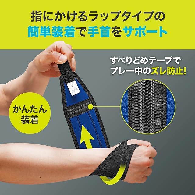 【手首の軽い圧迫・保護に】親指にかけて巻くだけの簡単装着。手首を軽くホールドし、プレーをサポートします。