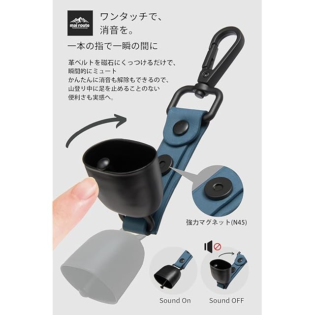 [ワンタッチで、消音を。]金属製の鈴を、革ベルトの磁石にくっつけるだけで、瞬間的にミュート。一本の指で一瞬の間に、かんたんに消音も解除もできるので、山登り中に足を止めることのない便利さも実感へ。使う人にもやさしい、快適なミュート機能です。