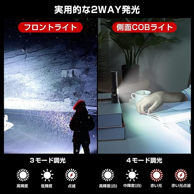 【長押し2秒で自動消灯 & 7モード調光ズーム式】アップグレード版スイッチの設計は従来の消灯不便を回避したので、任意モードスイッチを長押すだけで、すばやく照明をオフにできます。ズーム性能の向上により、より遠く、より広く照射が可能になります。7段階の点灯モードが用意されています。スイッチを押すと高輝度-中輝度-点滅-OFFの3つのヘッドライトモードを切り替えます。すばやくスイッチを2回押すとCOB白ランプの高輝度-COB白ランプの低輝度-COB赤信号-COB赤点滅-OFFの4つの照明モードがオンになり、各種の場面に対応できます。