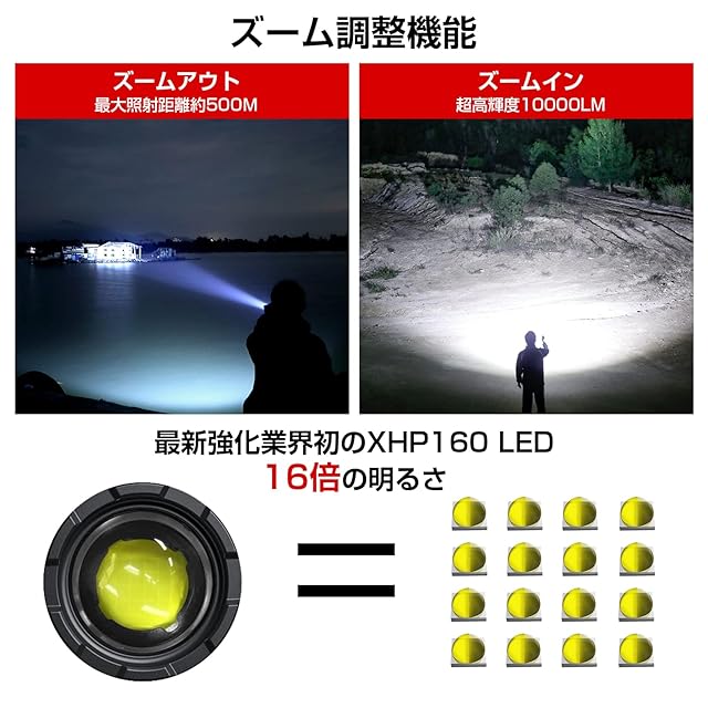 商品名:Eornmor 懐中電灯 強力【防災士監修・超高輝度・XHP160チップ】5000mAh 26650バッテリー付 軍用 最強 Type-C充電式/電池式 単4電池適用 ハンディライト COB作業灯 IPX6防水 7モード調光 ズーム式 耐衝撃 残量表示機能 作業用 停電 地震 避難対策 防災グッズ