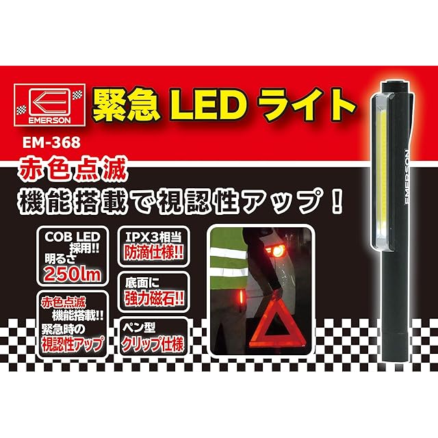 エマーソン(Emerson) 緊急LEDワークライト 警告灯 赤色点滅モード 乾電池式 IPX3相当 防滴仕様 COB LED採用 ハイ&ローの白色灯で作業灯や懐中電灯として 緊急時に早く後続車両に存在を知らせて事故防止 持ち運び・保管に便利なコンパクト設計 底面に強力磁石 ペン型クリップ仕様で手ぶらで作業
