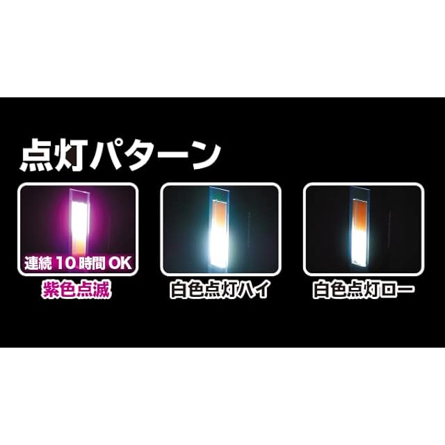 ★切り替え可能なハイ&ローの白色灯も装備しているので作業灯や懐中電灯として、様々な場面で活躍します。★COB LED採用 白点灯Hi:最大明るさ200lm★IPX3相当 防滴仕様!!雨などの水滴が掛かっても大丈夫です。★【連続使用時間】紫点滅:10時間 白点灯Hi:3時間 白点灯Low:10時間