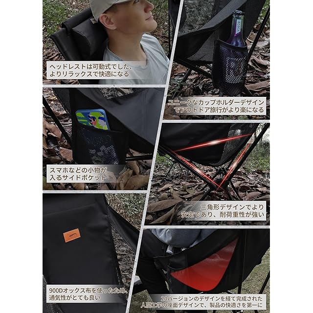✅【優れる耐久性と通気性】 アウトドア椅子は800Dポリエステルを採用した座面とメッシュの設計で、あつい季節も蒸し暑くなく、抜群の通気性と快適な座り心地を確保できます。座面の裏も防水加工し、雨でもタオルでちょっと拭くだけ座れます。さらに、座面を深くするし、ハンモックのように体にフィットし、ゆったりと包み込まれる座り心地を実現したレジャーチェアです。