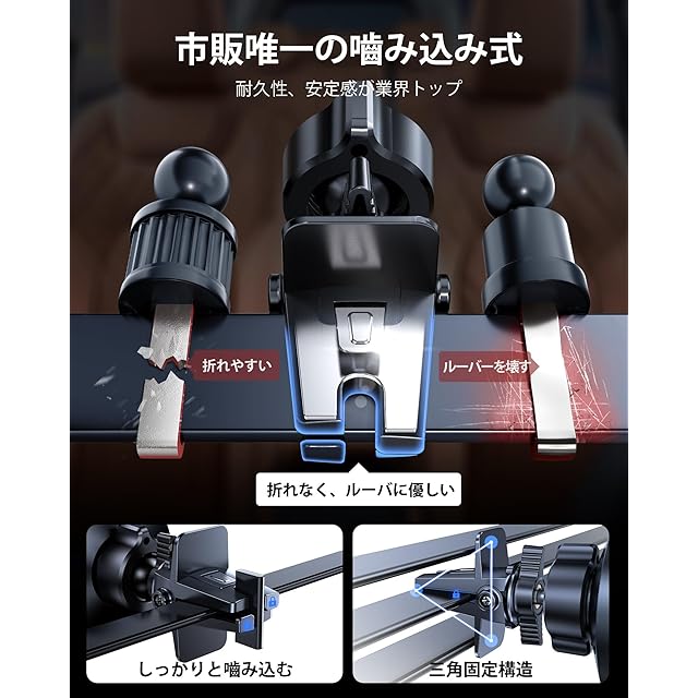 【最強なクリップ・抜群な安定感と耐久性】あなたの安全はAndobilが一番大事にしています。5年間経って、Andobilnのプロダクトマネージャーはようやく最強な第3世代螺旋クリップを開発できました!揺れやすい、クーラーに干渉する、ガタガタの音がする、強度が弱く、今までの送風口クリップと比べて、改良型のクリップは一線を画す、高品質な材料が採用され、揺らない、落ちない、異音なし、ガッチリ固定できます。クリップはアルミ合金と高品質なテフロン樹脂を使用して、耐久性が普通より30倍強くなります。また、クリップの内側に高品質なシリコンゴムがあり、車にも優しいです。更に、従来型のフック式や3段クリップ式と比べて、クリップの先は平らではなく噛み込む様に改良され(ワニの歯のように)、がっちりと吹き出し口に装着できます。どんな激しい悪路でも車 スマホホルダーが落ちることはなく、安心して運転に集中します。※クリップは縦型のエアコン吹き出し口はサポートしますが、円形の送風口はサポートしません。購入する前に、どうかお確かめください。