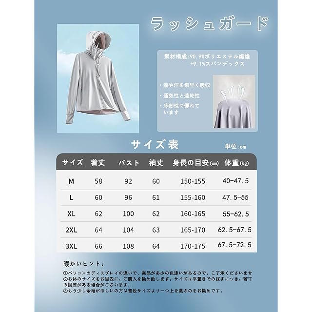 【幅広く着用できる】様々なシーンで使える1着あれば安心の万能パーカーです。海やプールに行く時、水着のアウターとしてはもちろん、通勤通学の時も日焼け止め用服としてtシャツの上に羽織るのもいいですし、寒すぎる冷房の中に必須のアウターとしても便利です。また日頃体型カバーにもなれます、機能性重視の一方、おしゃれを楽しんでいただける一着。人気の無地系ラッシュパーカー。合わせやすいデザインは、様々なシーンで着用でき、スタイリッシュで汎用性の高いデザインです。お届いた商品についてなにか問題がありましたらお気軽にご連絡をお願い致します。お客様に最高のアフターサービスを提供することを約束します。